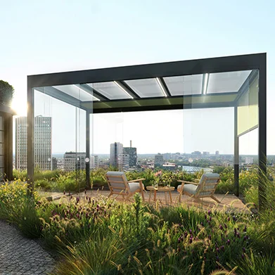 • Integration von Schiebeelementen aus Glas, Holz oder Aluminium als seitlicher Sicht- und Wetterschutz